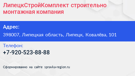 ЛипецкСтройКомплект, строительно-монтажная компания по адресу 398007, Липецкая область, Липецк, Ковалёва, 101 в дальнейшем Организация, размещена в следующих категориях: