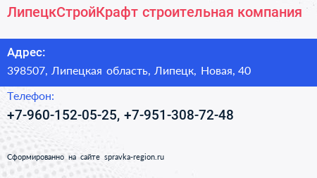 ЛипецкСтройКрафт, строительная компания по адресу 398507, Липецкая область, Липецк, Новая, 40 в дальнейшем Организация, размещена в следующих категориях: