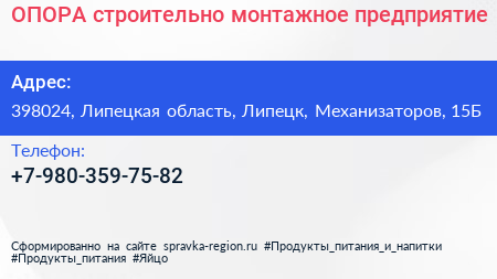 ОПОРА, строительно монтажное предприятие по адресу 398024, Липецкая область, Липецк, Механизаторов, 15Б в дальнейшем Организация, размещена в следующих категориях: