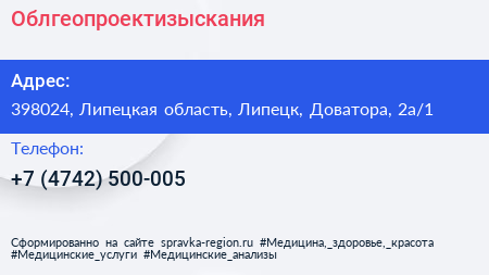 Облгеопроектизыскания по адресу 398024, Липецкая область, Липецк, Доватора, 2а/1 в дальнейшем Организация, размещена в следующих категориях: