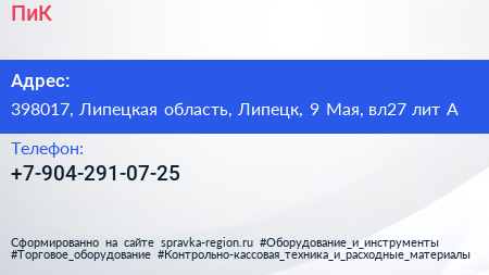 ПиК по адресу 398017, Липецкая область, Липецк, 9 Мая, вл27 лит А в дальнейшем Организация, размещена в следующих категориях: