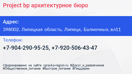 Project bp, архитектурное бюро по адресу 398002, Липецкая область, Липецк, Балмочных, вл11 в дальнейшем Организация, размещена в следующих категориях: