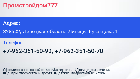 Промстройдом777 по адресу 398532, Липецкая область, Липецк, Рукавцова, 1 в дальнейшем Организация, размещена в следующих категориях: