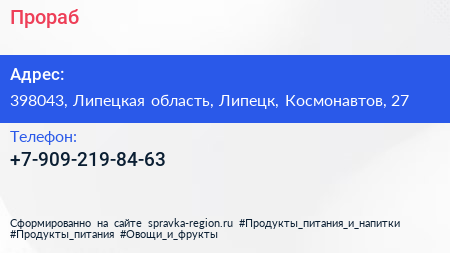 Прораб по адресу 398043, Липецкая область, Липецк, Космонавтов, 27 в дальнейшем Организация, размещена в следующих категориях: