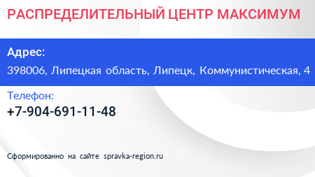 РАСПРЕДЕЛИТЕЛЬНЫЙ ЦЕНТР МАКСИМУМ по адресу 398006, Липецкая область, Липецк, Коммунистическая, 4 в дальнейшем Организация, размещена в следующих категориях: