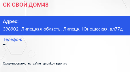 СК СВОЙ ДОМ48 по адресу 398902, Липецкая область, Липецк, Юношеская, вл77д в дальнейшем Организация, размещена в следующих категориях: