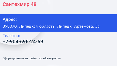 Сантехмир 48 по адресу 398070, Липецкая область, Липецк, Артёмова, 5а в дальнейшем Организация, размещена в следующих категориях: