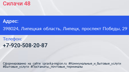 Силачи 48 по адресу 398024, Липецкая область, Липецк, проспект Победы, 29 в дальнейшем Организация, размещена в следующих категориях: