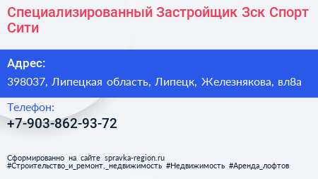 Специализированный Застройщик Зск Спорт-Сити по адресу 398037, Липецкая область, Липецк, Железнякова, вл8а в дальнейшем Организация, размещена в следующих категориях: