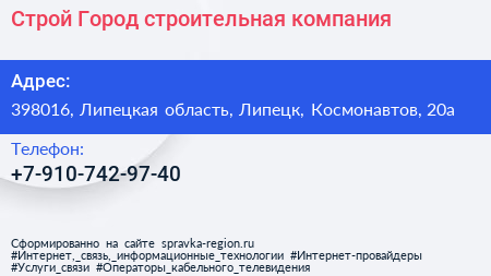 Строй Город, строительная компания по адресу 398016, Липецкая область, Липецк, Космонавтов, 20а в дальнейшем Организация, размещена в следующих категориях: