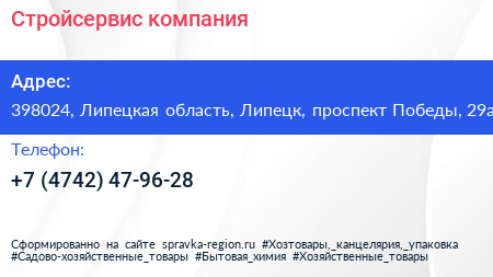 Стройсервис, компания по адресу 398024, Липецкая область, Липецк, проспект Победы, 29а в дальнейшем Организация, размещена в следующих категориях: