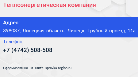Теплоэнергетическая компания по адресу 398037, Липецкая область, Липецк, Трубный проезд, 11а в дальнейшем Организация, размещена в следующих категориях: