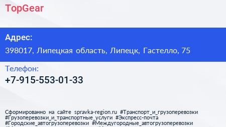 TopGear по адресу 398017, Липецкая область, Липецк, Гастелло, 75 в дальнейшем Организация, размещена в следующих категориях: