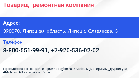 Товарищ+, ремонтная компания по адресу 398070, Липецкая область, Липецк, Славянова, 3 в дальнейшем Организация, размещена в следующих категориях: