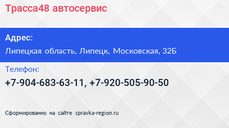 Трасса48, автосервис по адресу Липецкая область, Липецк, Московская, 32Б в дальнейшем Организация, размещена в следующих категориях: