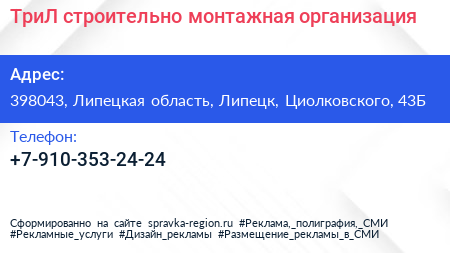 ТриЛ, строительно-монтажная организация по адресу 398043, Липецкая область, Липецк, Циолковского, 43Б в дальнейшем Организация, размещена в следующих категориях: