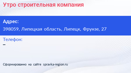 Утро, строительная компания по адресу 398059, Липецкая область, Липецк, Фрунзе, 27 в дальнейшем Организация, размещена в следующих категориях: