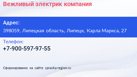 Вежливый электрик, компания по адресу 398059, Липецкая область, Липецк, Карла Маркса, 27 в дальнейшем Организация, размещена в следующих категориях: