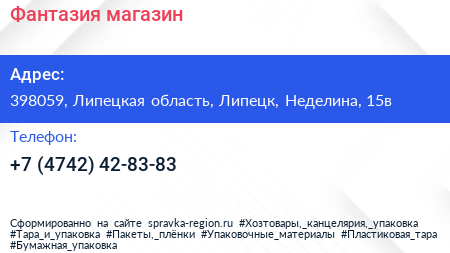 Фантазия, магазин по адресу 398059, Липецкая область, Липецк, Неделина, 15в в дальнейшем Организация, размещена в следующих категориях:
