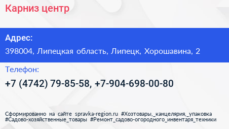 Карниз-центр по адресу 398004, Липецкая область, Липецк, Хорошавина, 2 в дальнейшем Организация, размещена в следующих категориях: