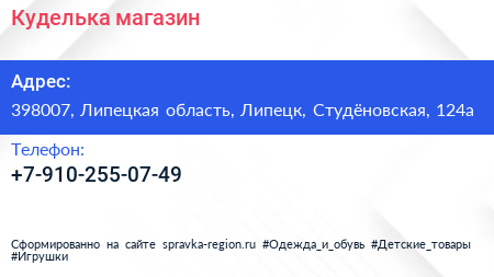 Куделька, магазин по адресу 398007, Липецкая область, Липецк, Студёновская, 124а в дальнейшем Организация, размещена в следующих категориях:
