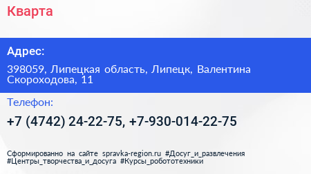 Кварта по адресу 398059, Липецкая область, Липецк, Валентина Скороходова, 11 в дальнейшем Организация, размещена в следующих категориях: