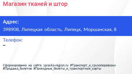 Магазин тканей и штор по адресу 398908, Липецкая область, Липецк, Моршанская, 8 в дальнейшем Организация, размещена в следующих категориях: