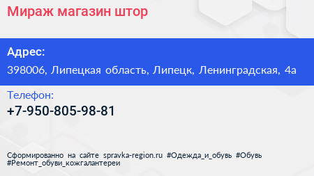 Мираж, магазин штор по адресу 398006, Липецкая область, Липецк, Ленинградская, 4а в дальнейшем Организация, размещена в следующих категориях: