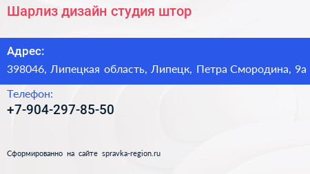 Шарлиз, дизайн-студия штор по адресу 398046, Липецкая область, Липецк, Петра Смородина, 9а в дальнейшем Организация, размещена в следующих категориях: