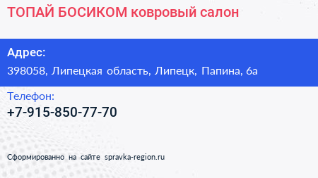 ТОПАЙ БОСИКОМ, ковровый салон по адресу 398058, Липецкая область, Липецк, Папина, 6а в дальнейшем Организация, размещена в следующих категориях: