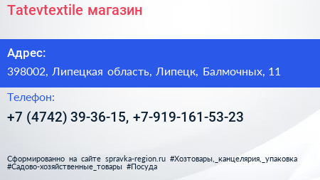 Tatevtextile, магазин по адресу 398002, Липецкая область, Липецк, Балмочных, 11 в дальнейшем Организация, размещена в следующих категориях: