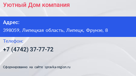 Уютный Дом, компания по адресу 398059, Липецкая область, Липецк, Фрунзе, 8 в дальнейшем Организация, размещена в следующих категориях:
