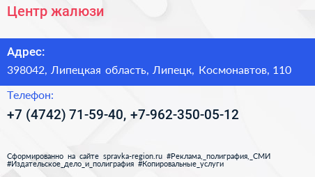 Центр жалюзи по адресу 398042, Липецкая область, Липецк, Космонавтов, 110 в дальнейшем Организация, размещена в следующих категориях: