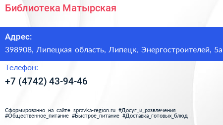 Библиотека Матырская по адресу 398908, Липецкая область, Липецк, Энергостроителей, 5а в дальнейшем Организация, размещена в следующих категориях: