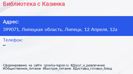 Библиотека, с. Казинка по адресу 399071, Липецкая область, Липецк, 12 Апреля, 12а в дальнейшем Организация, размещена в следующих категориях: