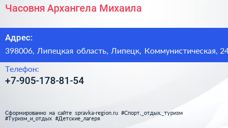 Часовня Архангела Михаила по адресу 398006, Липецкая область, Липецк, Коммунистическая, 24 в дальнейшем Организация, размещена в следующих категориях: