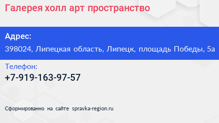 Галерея холл, арт-пространство по адресу 398024, Липецкая область, Липецк, площадь Победы, 5а в дальнейшем Организация, размещена в следующих категориях:
