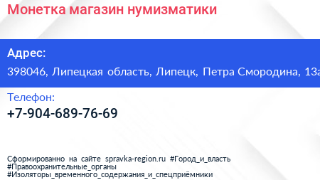Монетка, магазин нумизматики по адресу 398046, Липецкая область, Липецк, Петра Смородина, 13а в дальнейшем Организация, размещена в следующих категориях: