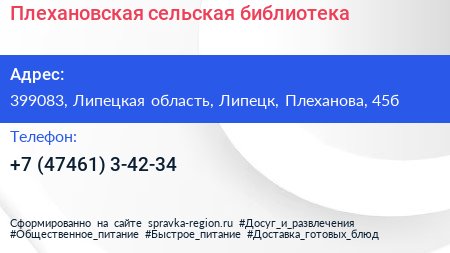 Плехановская сельская библиотека по адресу 399083, Липецкая область, Липецк, Плеханова, 45б в дальнейшем Организация, размещена в следующих категориях: