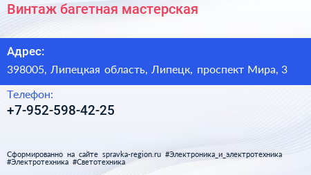 Винтаж, багетная мастерская по адресу 398005, Липецкая область, Липецк, проспект Мира, 3 в дальнейшем Организация, размещена в следующих категориях:
