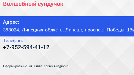 Волшебный сундучок по адресу 398024, Липецкая область, Липецк, проспект Победы, 19а в дальнейшем Организация, размещена в следующих категориях: