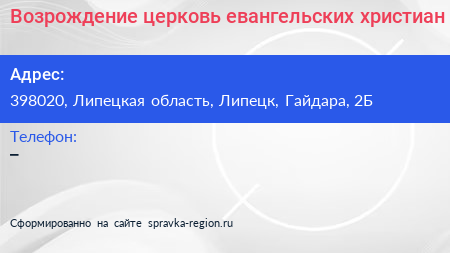 Возрождение, церковь евангельских христиан по адресу 398020, Липецкая область, Липецк, Гайдара, 2Б в дальнейшем Организация, размещена в следующих категориях: