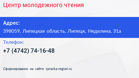 Центр молодежного чтения по адресу 398059, Липецкая область, Липецк, Неделина, 31а в дальнейшем Организация, размещена в следующих категориях: