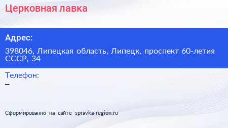 Церковная лавка по адресу 398046, Липецкая область, Липецк, проспект 60-летия СССР, 34 в дальнейшем Организация, размещена в следующих категориях: