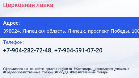 Церковная лавка по адресу 398024, Липецкая область, Липецк, проспект Победы, 100 в дальнейшем Организация, размещена в следующих категориях:
