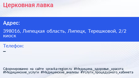 Церковная лавка по адресу 398016, Липецкая область, Липецк, Терешковой, 2/2 киоск в дальнейшем Организация, размещена в следующих категориях: