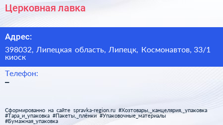 Церковная лавка по адресу 398032, Липецкая область, Липецк, Космонавтов, 33/1 киоск в дальнейшем Организация, размещена в следующих категориях: