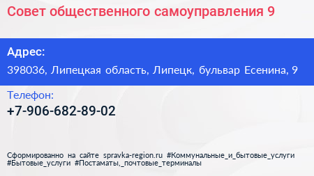 Совет общественного самоуправления №9 по адресу 398036, Липецкая область, Липецк, бульвар Есенина, 9 в дальнейшем Организация, размещена в следующих категориях: