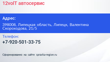 12volT, автосервис по адресу 398008, Липецкая область, Липецк, Валентина Скороходова, 21/5 в дальнейшем Организация, размещена в следующих категориях:
