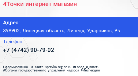 4Точки, интернет-магазин по адресу 398902, Липецкая область, Липецк, Ударников, 95 в дальнейшем Организация, размещена в следующих категориях: